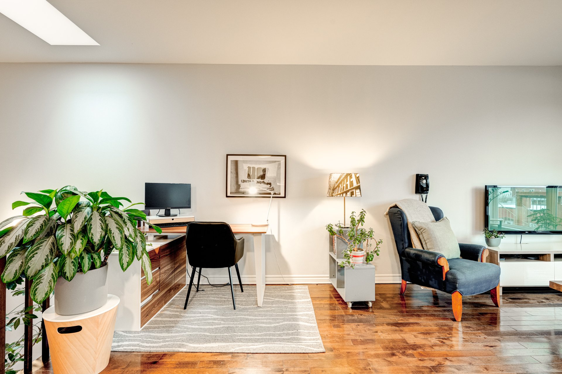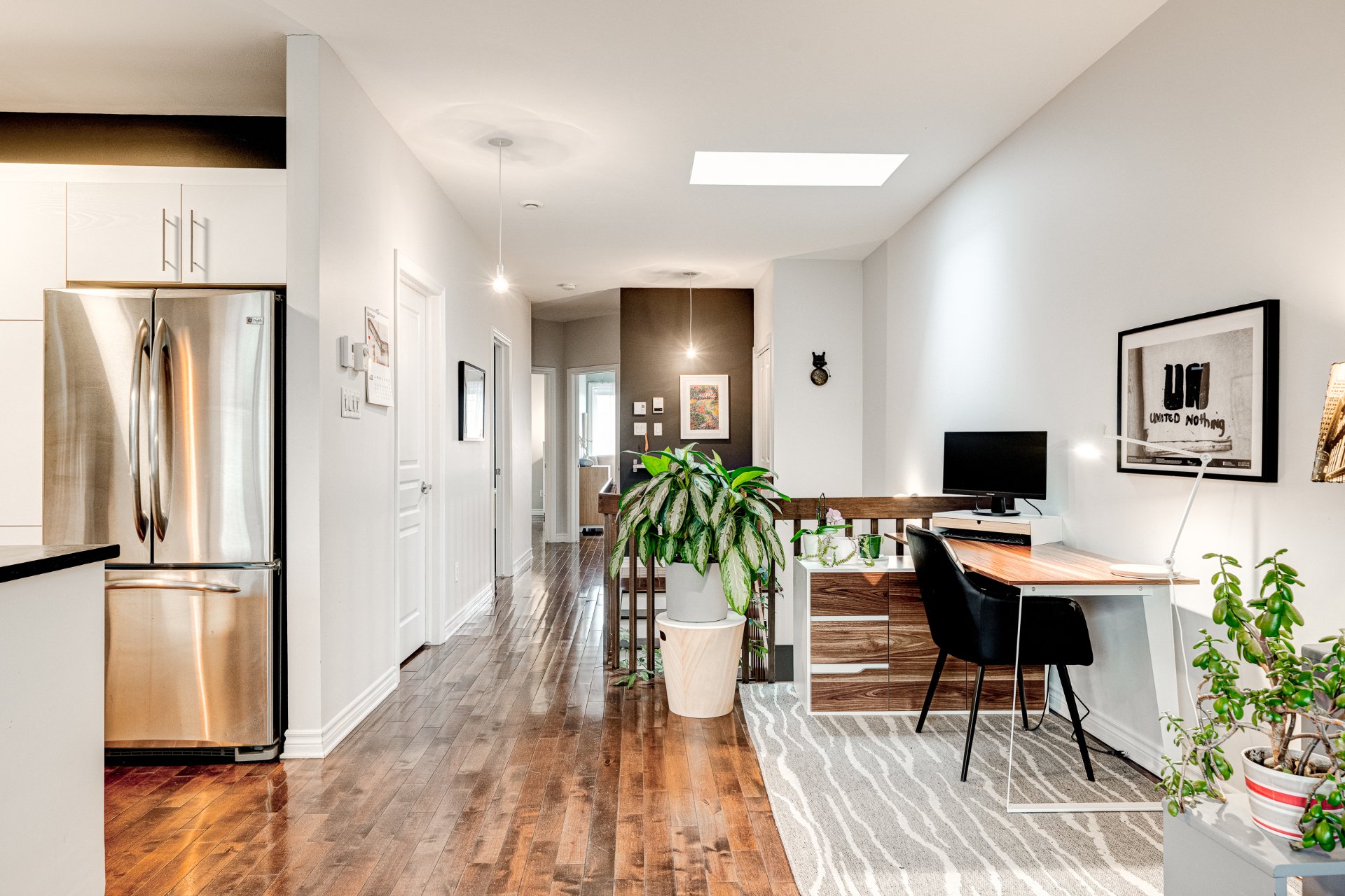 un coin bureau, la salle à manger et la cuisine, et s'ouvre