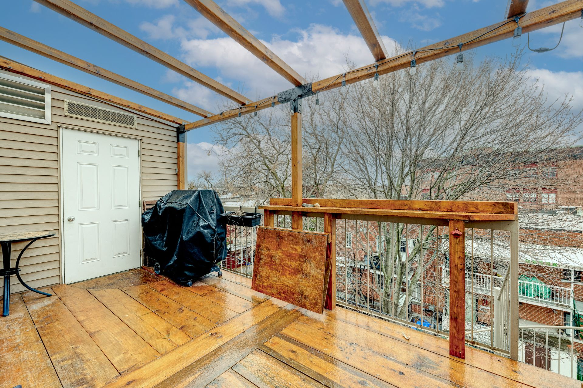 Terrasse en bois aménagée avec pergola, table pliante,